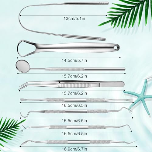 【Dental Tools Kit】Include dental mirror, 2*tongue scraper, dental tweezers, 2*dual-ended tartar scraper, dual-ended dental probe, dual ended gum cleaner and storage box.