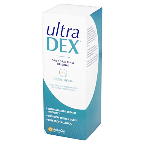 UltraDEX Daily Oral Rinse Original 500 ml Die fortschrittliche IQ ActiveOxi-Technologie in dieser Mundspülung beseitigt klinisch nachweislich alsbald Mundgeruchverbindungen (flüchtige Schwefelverbindungen) zugunsten ein 12-stündiges Vertrauen in frischen Atem. Dank zweimal tägliches Waschen wird Mundgeruch 12 Stunden lang beseitigt und gleichzeitig Zähne und Zahnfleisch vor schädlichen Bakterien geschützt. Dank die Spülung werden die Zähne auf natürliche Weise weiß, indem alltägliche Flecken entfernt werden. UltraDEX Daily Oral Rinse benötigt keinen Geschmack, da es Mundgeruch beseitigt und nicht maskiert. Um einen Minzgeschmack zu erleben, geben Sie einfach den Inhalt des beiliegenden Geschmacksbeutels in die gesamte Spülflasche und schütteln Sie ihn vor jedem Gebrauch in Ordnung.