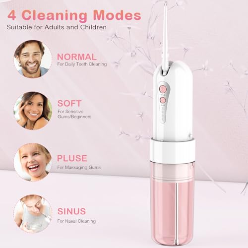 [Vielseitige Reinigungsmodi]: Der Wasserzahnreiniger bietet vier Reinigungsmodi (Mittelmäßig, Friedliebend, Puls und Nasenmodus) und wird mit fünf verschiedenen austauschbaren Spritzdüsen geliefert, um Ihren Mund- und Nasenpflegebedürfnissen gerecht zu werden. Mit der neuesten Puls-Technologie des Wasserzahnreinigers (Druckbereich von 40-120 PSI) entfernt er effektiv 99,99 % der Essensreste, hält die Zähne gesund und sorgt für ein selbstbewusstes Lächeln