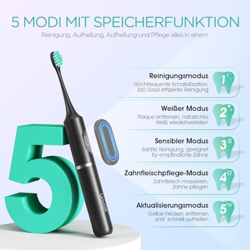 Fünf Reinigungsmodi: Diese schallzahnbürsten verfügt über die Modi Reinigen, Aufhellen, Sensitiv, Zahnfleischpflege und Frische, die für unterschiedliche Mundzustände nach Maß sind; Drücken Sie den Einschaltknopf innerhalb von acht Sekunden wieder, um zwischen den verschiedenen Modi zu konvertieren, was einfach zu bedienen ist