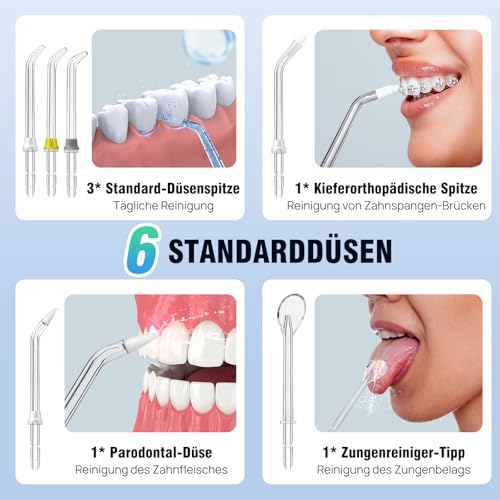 🌱【6 verschiedene Arten von Düsen】: Die tägliche Reinigung enthält 3* Standarddüsen, 1* kieferorthopädische Düse für die Reinigung von Zahnspangen-Brücken, die für die Zahnfleischreinigung enthält 1* Zungenreinigungsspitze, um die Zunge zu reinigen, und 1* Parodontalspitze, um den Zahnhalteapparat zu reinigen.Verschiedene Düsen sind in Bereitschaft, um Ihre verschiedenen Reinigungsbedürfnisse zu beenden.