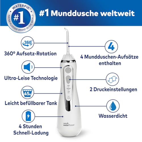 Waterpik Advanced Kabellose Munddusche, Water Flosser Testsieger 2024, Precision Pulse Technologie, bis zu 99,9Prozent Plaque Entfernung, 4x Aufsätze, 3 individuelle Modi, Induktionsladesystem, Weiß