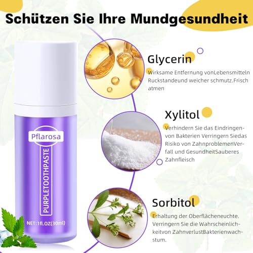 zahnpasta weisse zähne, Purple Whitening Zahnpasta 30ml – Lila Farbkorrektor Zahnpasta gegen Zahnverfärbungen, Tiefenreinigung & Zahnschmelzschutz, Frischer Atem