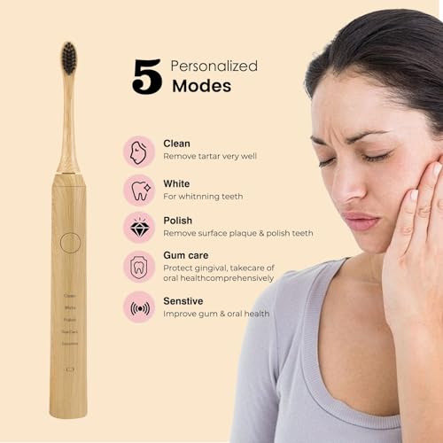 Unsere elektrische Bambus Zahnbürste verfügt über weiche BPT Borsten. Das Set enthält zwei auswechselbare Bambus Bürstenköpfe aus natürlichem Bambus und Pflanzenborsten. Die PBT Material Zahnbürstenborsten sind mäßig weich und schützen Zähne und Zahnfleisch. Die Borsten sind so geformt, dass sie gründlich reinigen und perfekt auf das Zahnfleisch und die Zähne passen und bieten vollen Abschirmung für Ihr empfindliches Zahnfleisch.